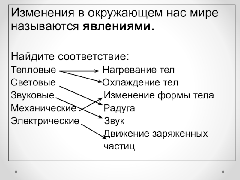 Изменения в окружающем нас мире называются явлениями. Найдите соответствие:Тепловые