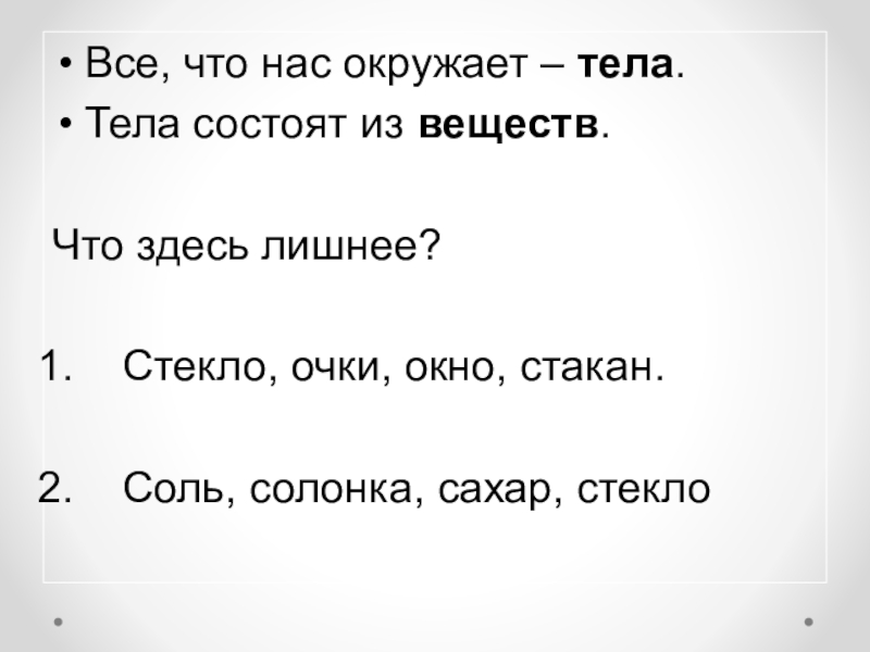 Все, что нас окружает – тела.Тела состоят из веществ.Что здесь лишнее?Стекло, очки, окно, стакан.Соль, солонка, сахар, стекло