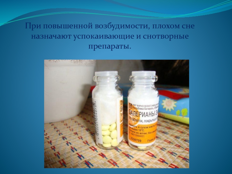 Слайд 31При повышенной возбудимости, плохом сне назначают успокаивающие и снотворные препараты.