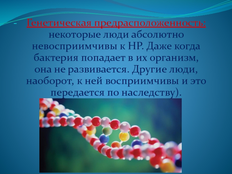 Слайд 10Генетическая предрасположенность: некоторые люди абсолютно невосприимчивы к НР. Даже когда бактерия