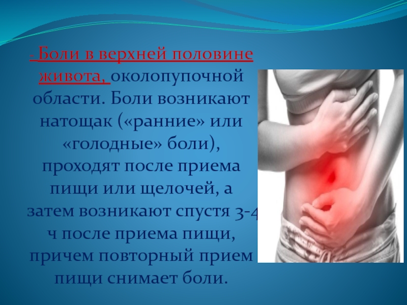 Слайд 14- Боли в верхней половине живота, околопупочной области. Боли возникают натощак
