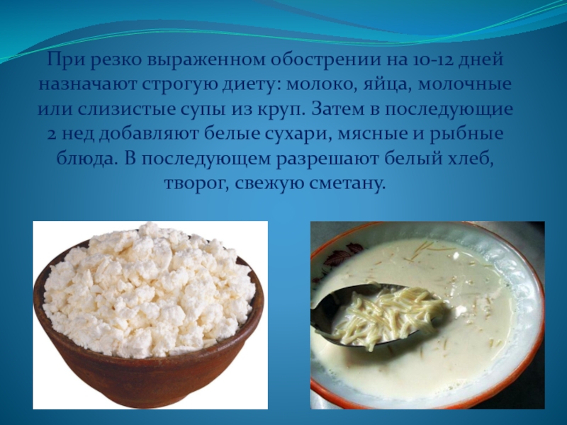 Слайд 22При резко выраженном обострении на 10-12 дней назначают строгую диету: молоко,