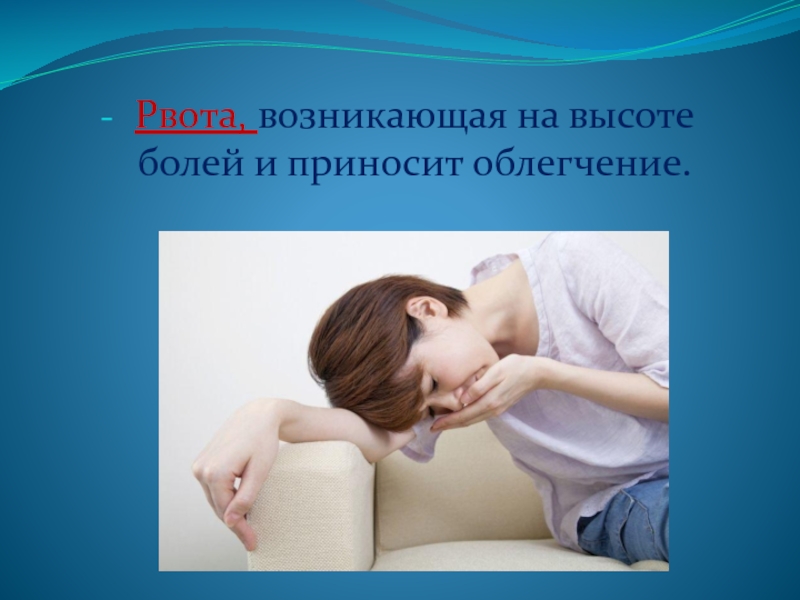 Слайд 13Рвота, возникающая на высоте болей и приносит облегчение.