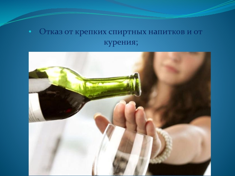 Слайд 34Отказ от крепких спиртных напитков и от курения;
