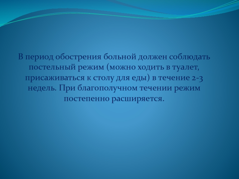 Слайд 23В период обострения больной должен соблюдать постельный режим (можно ходить в