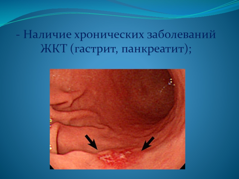 Слайд 5- Наличие хронических заболеваний ЖКТ (гастрит, панкреатит);