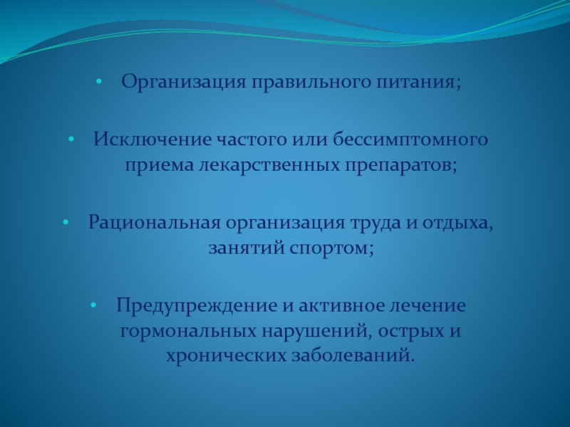 Предупреждение и активное лечение гормональных нарушений, острых и хронических заболеваний.
