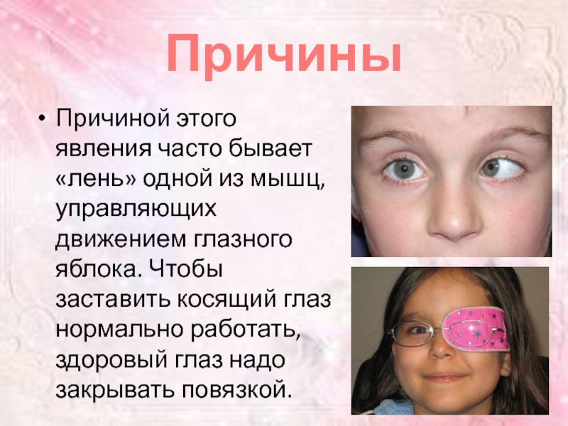 глазного яблока. Чтобы заставить косящий глаз нормально работать, здоровый глаз надо закрывать повязкой.