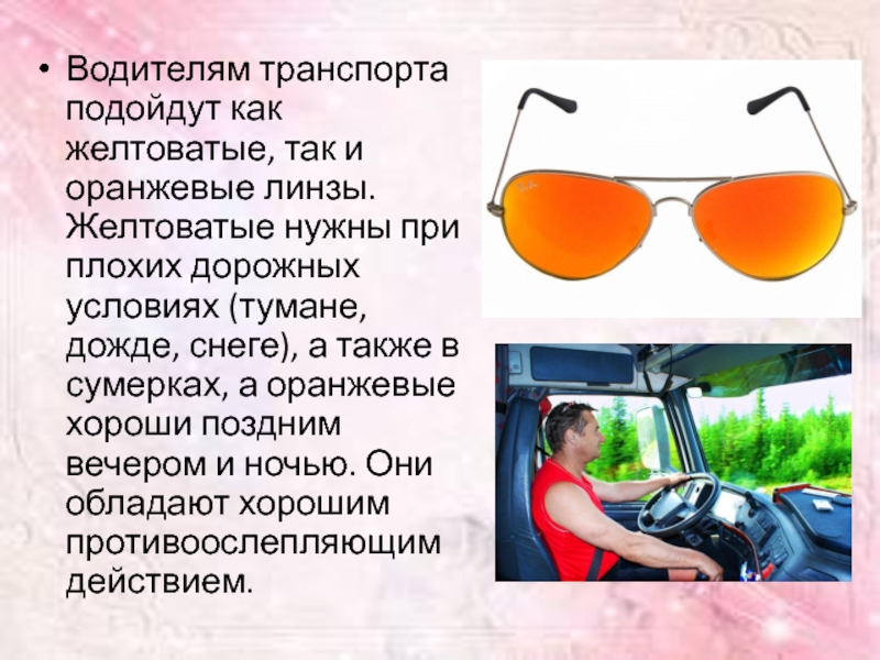 Слайд 39Водителям транспорта подойдут как желтоватые, так и оранжевые линзы. Желтоватые нужны