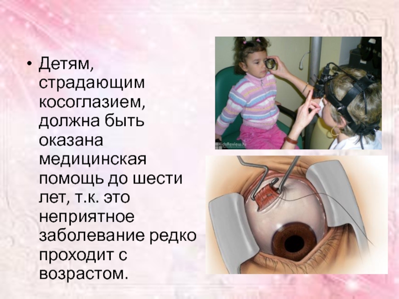 Слайд 15Детям, страдающим косоглазием, должна быть оказана медицинская помощь до шести лет,