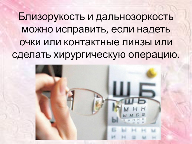 Слайд 9Близорукость и дальнозоркость можно исправить, если надеть очки или контактные линзы