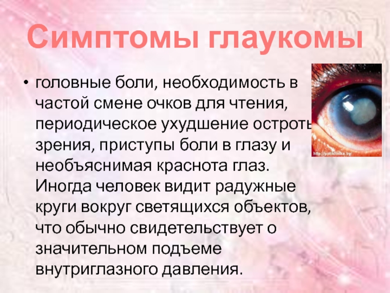 ухудшение остроты зрения, приступы боли в глазу и необъяснимая краснота глаз. Иногда человек видит радужные круги вокруг светящихся объектов, что обычно свидетельствует о значительном подъеме внутриглазного давления.
