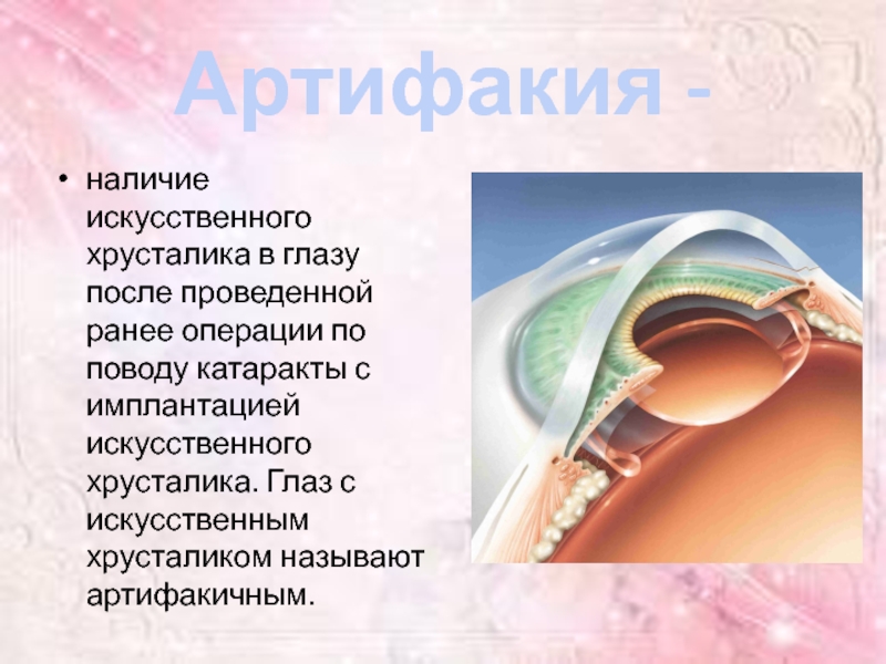 поводу катаракты с имплантацией искусственного хрусталика. Глаз с искусственным хрусталиком называют артифакичным.