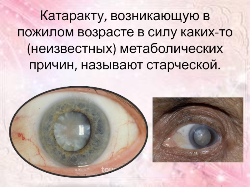 Слайд 28Катаракту, возникающую в пожилом возрасте в силу каких-то (неизвестных) метаболических причин,