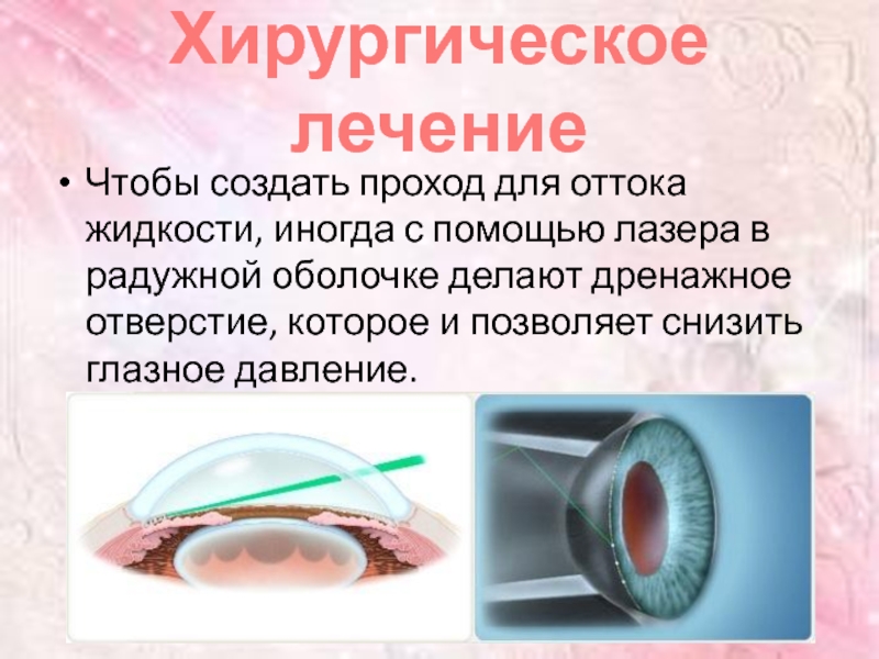 в радужной оболочке делают дренажное отверстие, которое и позволяет снизить глазное давление.