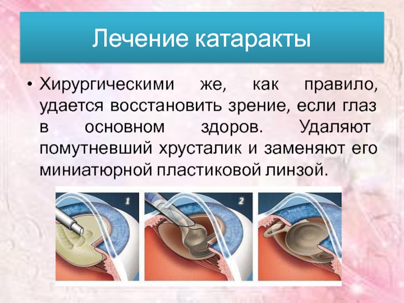 основном здоров. Удаляют помутневший хрусталик и заменяют его миниатюрной пластиковой линзой.