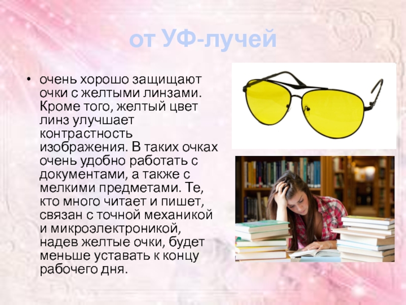 цвет линз улучшает контрастность изображения. В таких очках очень удобно работать с документами, а также с мелкими предметами. Те, кто много читает и пишет, связан с точной механикой и микроэлектроникой, надев желтые очки, будет меньше уставать к концу рабочего дня.