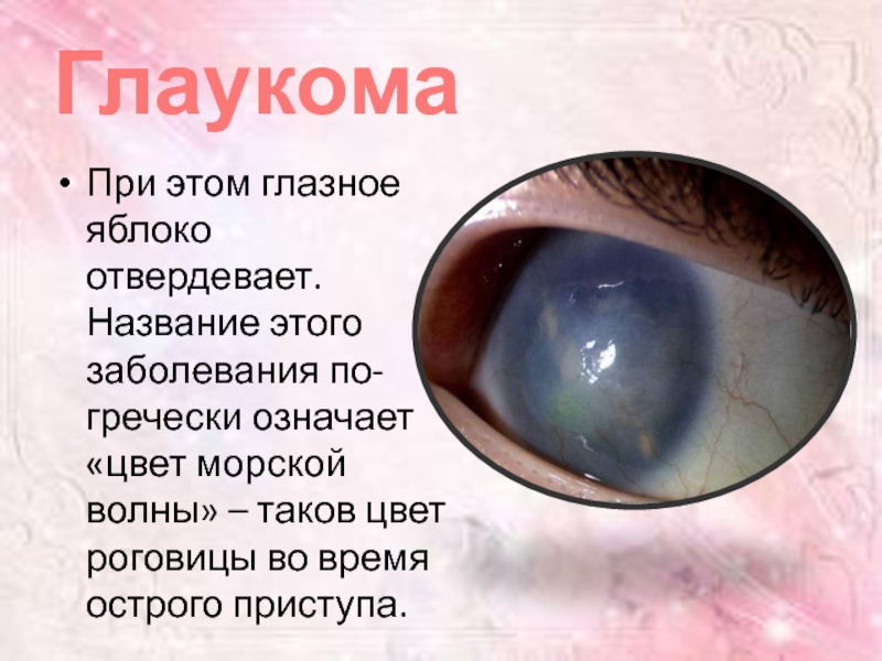 Слайд 19При этом глазное яблоко отвердевает. Название этого заболевания по-гречески означает «цвет