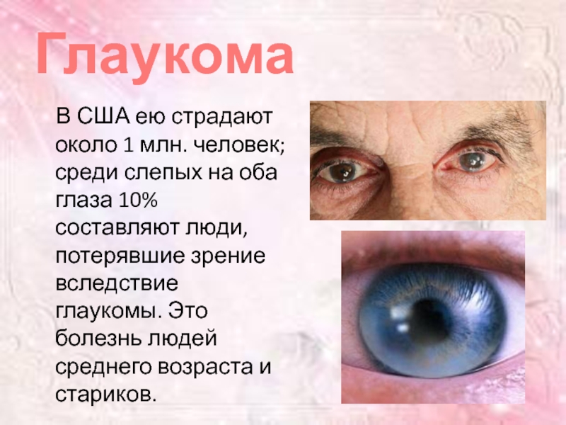 оба глаза 10% составляют люди, потерявшие зрение вследствие глаукомы. Это болезнь людей среднего возраста и стариков.