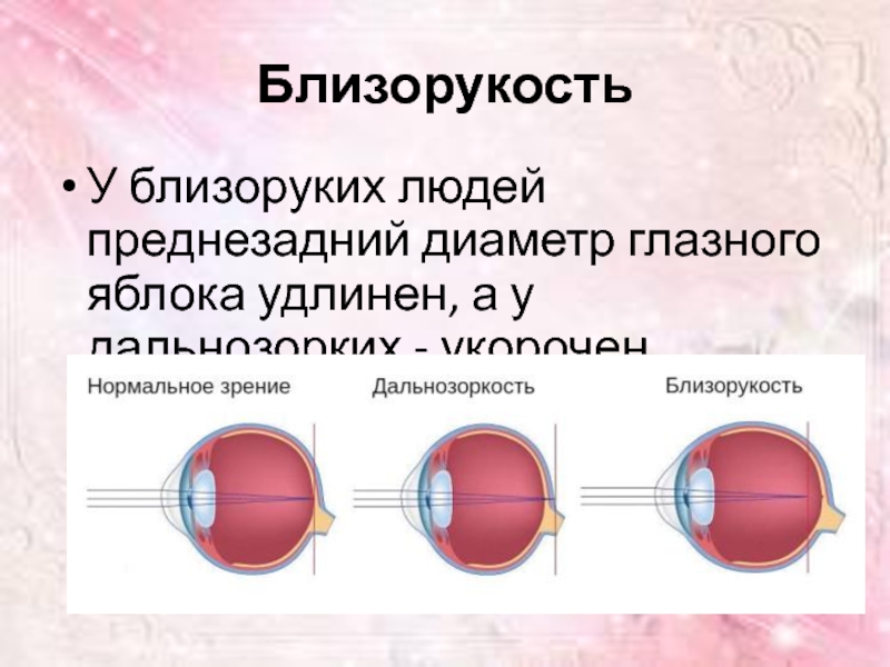 У близоруких людей преднезадний диаметр глазного яблока удлинен, а у дальнозорких