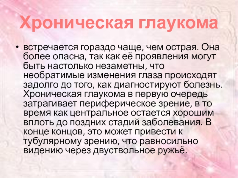 её проявления могут быть настолько незаметны, что необратимые изменения глаза происходят задолго до того, как диагностируют болезнь. Хроническая глаукома в первую очередь затрагивает периферическое зрение, в то время как центральное остается хорошим вплоть до поздних стадий заболевания. В конце концов, это может привести к тубулярному зрению, что равносильно видению через двуствольное ружьё.