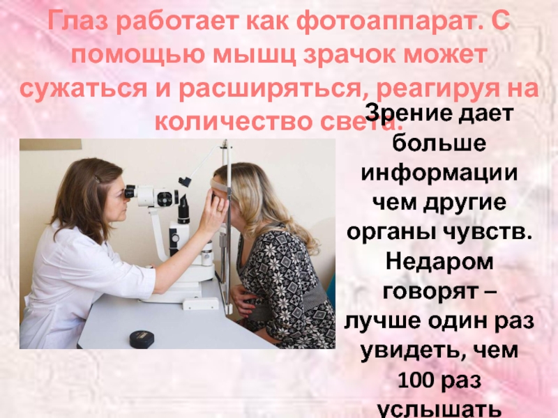 Слайд 3Глаз работает как фотоаппарат. С помощью мышц зрачок может сужаться и
