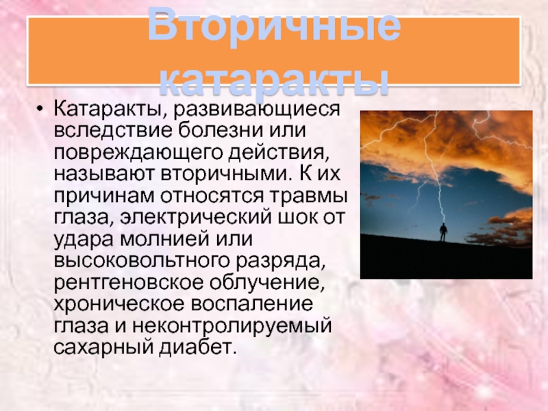 Катаракты, развивающиеся вследствие болезни или повреждающего действия, называют вторичными. К