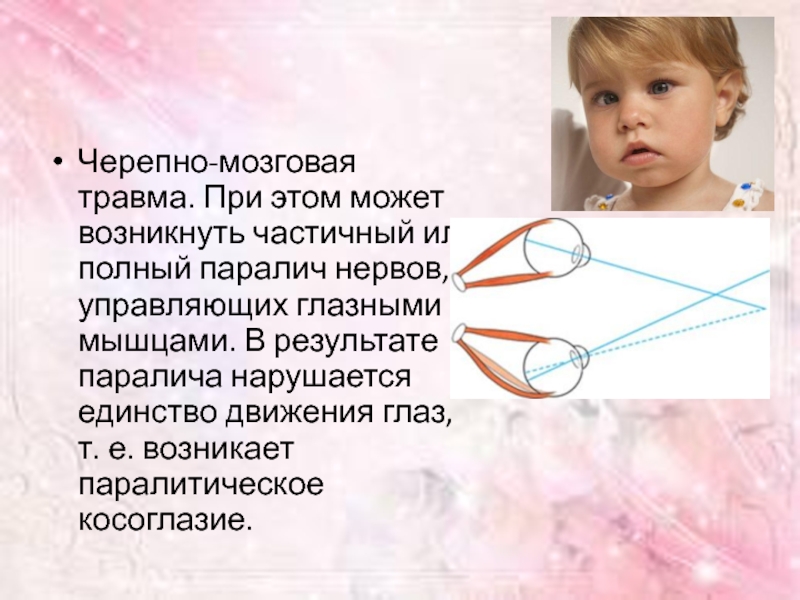 управляющих глазными мышцами. В результате паралича нарушается единство движения глаз, т. е. возникает паралитическое косоглазие.