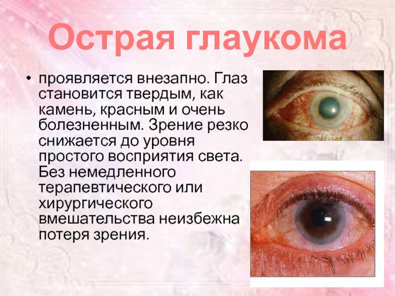 проявляется внезапно. Глаз становится твердым, как камень, красным и очень