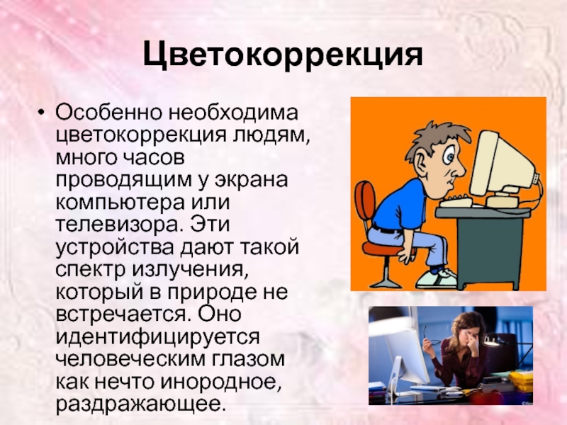 Особенно необходима цветокоррекция людям, много часов проводящим у экрана компьютера или