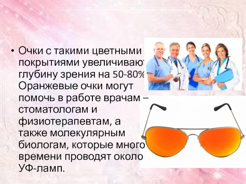 Слайд 40Очки с такими цветными покрытиями увеличивают глубину зрения на 50-80%. Оранжевые