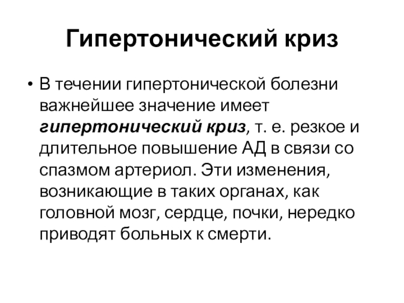 е. резкое и длительное повышение АД в связи со спазмом артериол. Эти изменения, возникающие в таких органах, как головной мозг, сердце, почки, нередко приводят больных к смерти.