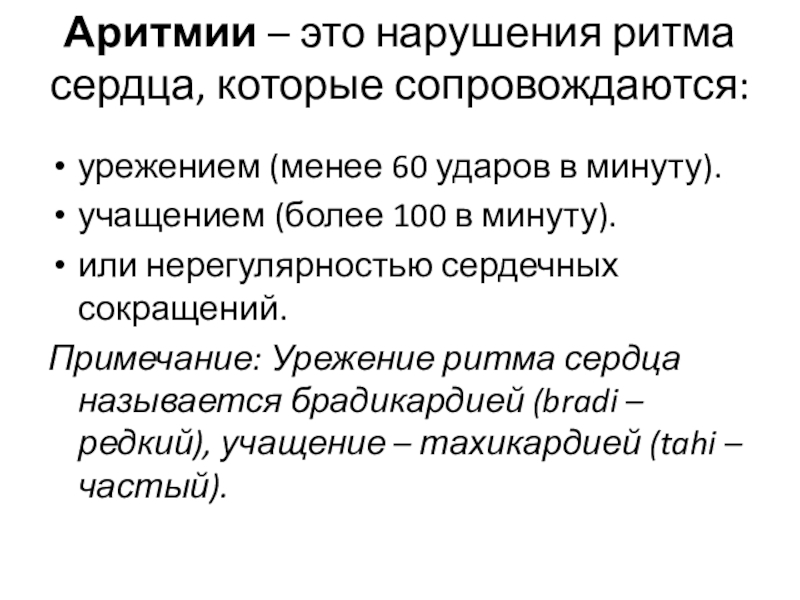 Слайд 10Аритмии – это нарушения ритма сердца, которые сопровождаются:
