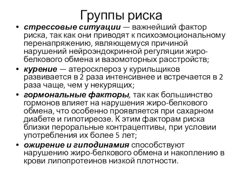 гормональные факторы, так как большинство гормонов влияет на нарушения жиро-белкового обмена, что особенно проявляется при сахарном диабете и гипотиреозе. К этим факторам риска близки пероральные контрацептивы, при условии употребления их более 5 лет;