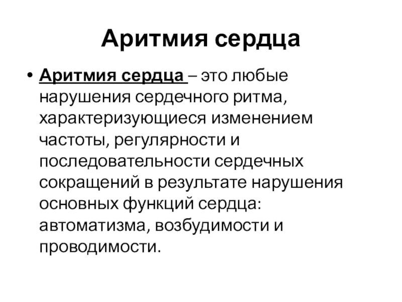 частоты, регулярности и последовательности сердечных сокращений в результате нарушения основных функций сердца: автоматизма, возбудимости и проводимости.