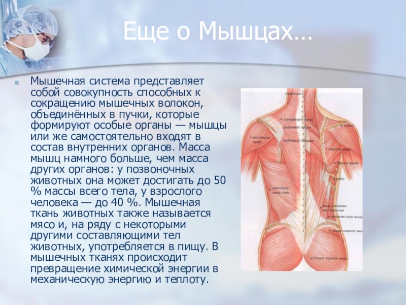 волокон, объединённых в пучки, которые формируют особые органы — мышцы или же самостоятельно входят в состав внутренних органов. Масса мышц намного больше, чем масса других органов: у позвоночных животных она может достигать до 50 % массы всего тела, у взрослого человека — до 40 %. Мышечная ткань животных также называется мясо и, на ряду с некоторыми другими составляющими тел животных, употребляется в пищу. В мышечных тканях происходит превращение химической энергии в механическую энергию и теплоту.