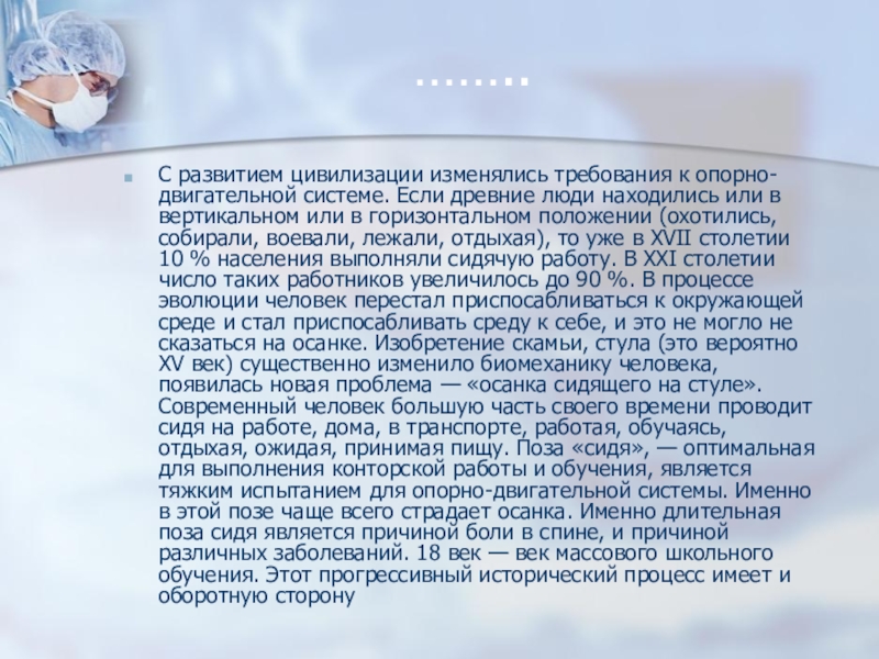 находились или в вертикальном или в горизонтальном положении (охотились, собирали, воевали, лежали, отдыхая), то уже в XVII столетии 10 % населения выполняли сидячую работу. В XXI столетии число таких работников увеличилось до 90 %. В процессе эволюции человек перестал приспосабливаться к окружающей среде и стал приспосабливать среду к себе, и это не могло не сказаться на осанке. Изобретение скамьи, стула (это вероятно XV век) существенно изменило биомеханику человека, появилась новая проблема — «осанка сидящего на стуле». Современный человек большую часть своего времени проводит сидя на работе, дома, в транспорте, работая, обучаясь, отдыхая, ожидая, принимая пищу. Поза «сидя», — оптимальная для выполнения конторской работы и обучения, является тяжким испытанием для опорно-двигательной системы. Именно в этой позе чаще всего страдает осанка. Именно длительная поза сидя является причиной боли в спине, и причиной различных заболеваний. 18 век — век массового школьного обучения. Этот прогрессивный исторический процесс имеет и оборотную сторону