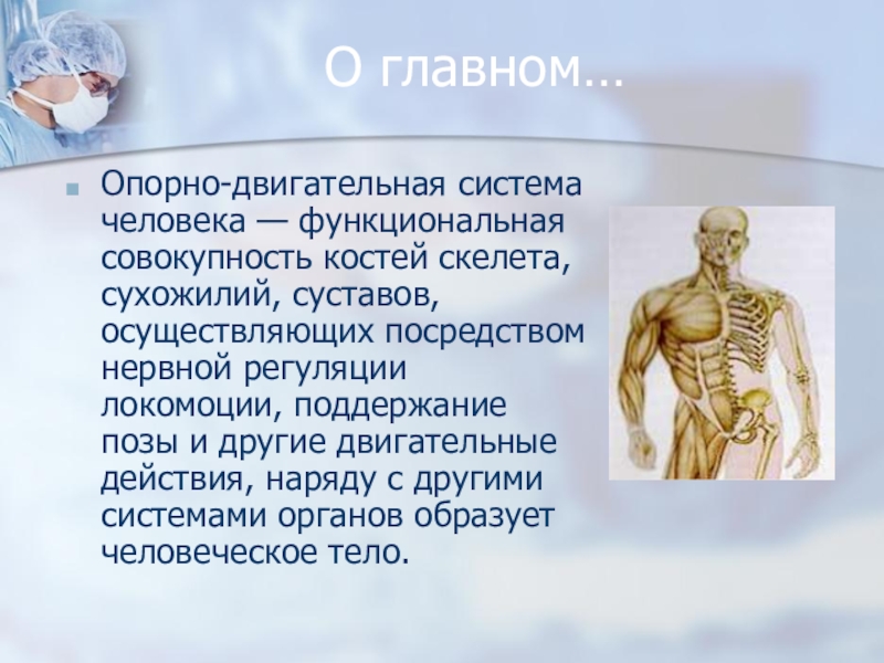 Опорно-двигательная система человека — функциональная совокупность костей скелета, сухожилий, суставов,