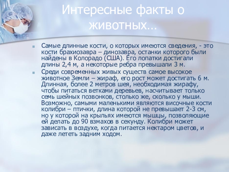 Среди современных живых существ самое высокое животное Земли – жираф, его рост может достигать 6 м. Длинная, более 2 метров шея, необходимая жирафу, чтобы питаться ветками деревьев, насчитывает только семь шейных позвонков, столько же, сколько у мыши. Возможно, самыми маленькими являются височные кости колибри – птички, длина которой не превышает 2-3 см, но у которой на крыльях имеются мышцы, позволяющие ей делать до 90 взмахов в секунду. Колибри может зависать в воздухе, когда питается нектаром цветов, и даже лететь задним ходом.