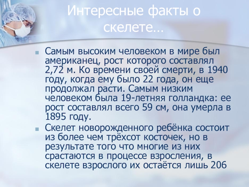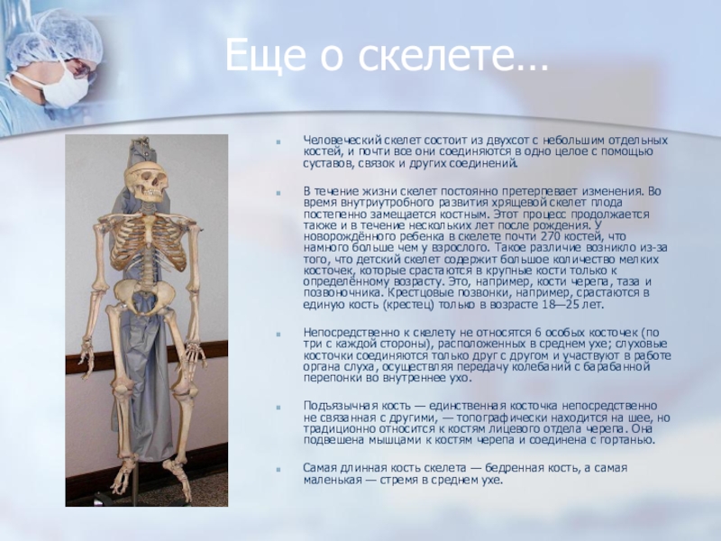 Скелет новорожденного ребёнка состоит из более чем трёхсот косточек, но в результате того что многие из них срастаются в процессе взросления, в скелете взрослого их остаётся лишь 206