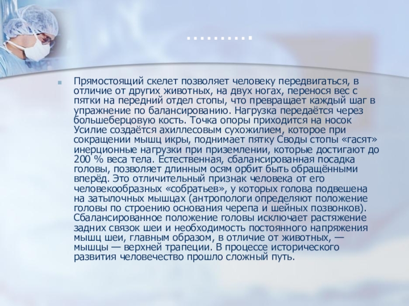 двух ногах, перенося вес с пятки на передний отдел стопы, что превращает каждый шаг в упражнение по балансированию. Нагрузка передаётся через большеберцовую кость. Точка опоры приходится на носок Усилие создаётся ахиллесовым сухожилием, которое при сокращении мышц икры, поднимает пятку Своды стопы «гасят» инерционные нагрузки при приземлении, которые достигают до 200 % веса тела. Естественная, сбалансированная посадка головы, позволяет длинным осям орбит быть обращёнными вперёд. Это отличительный признак человека от его человекообразных «собратьев», у которых голова подвешена на затылочных мышцах (антропологи определяют положение головы по строению основания черепа и шейных позвонков). Сбалансированное положение головы исключает растяжение задних связок шеи и необходимость постоянного напряжения мышц шеи, главным образом, в отличие от животных, — мышцы — верхней трапеции. В процессе исторического развития человечество прошло сложный путь.