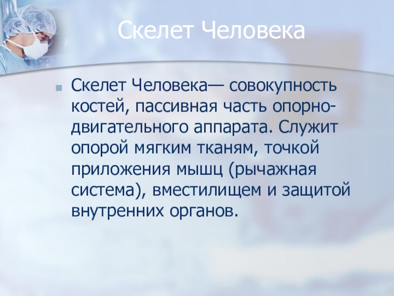 Скелет Человека— совокупность костей, пассивная часть опорно-двигательного аппарата. Служит опорой