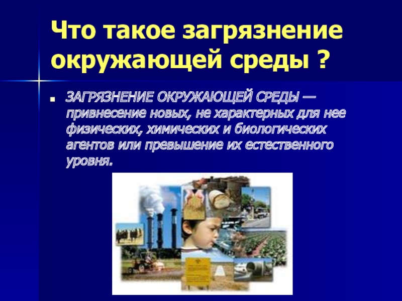 Что такое загрязнение окружающей среды ?ЗАГРЯЗНЕНИЕ ОКРУЖАЮЩЕЙ СРЕДЫ — привнесение новых, не характерных для нее физических, химических и биологических агентов или превышение их естественного уровня.