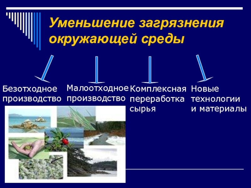 Уменьшение загрязнения окружающей средыБезотходное производство Малоотходное производство Комплексная переработка сырья Новые технологии и материалы