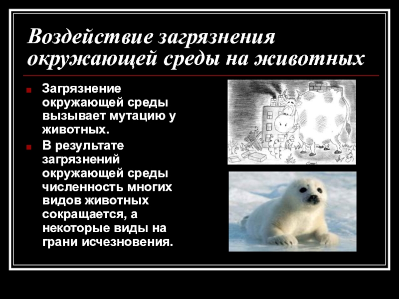Слайд 7Воздействие загрязнения окружающей среды на животных