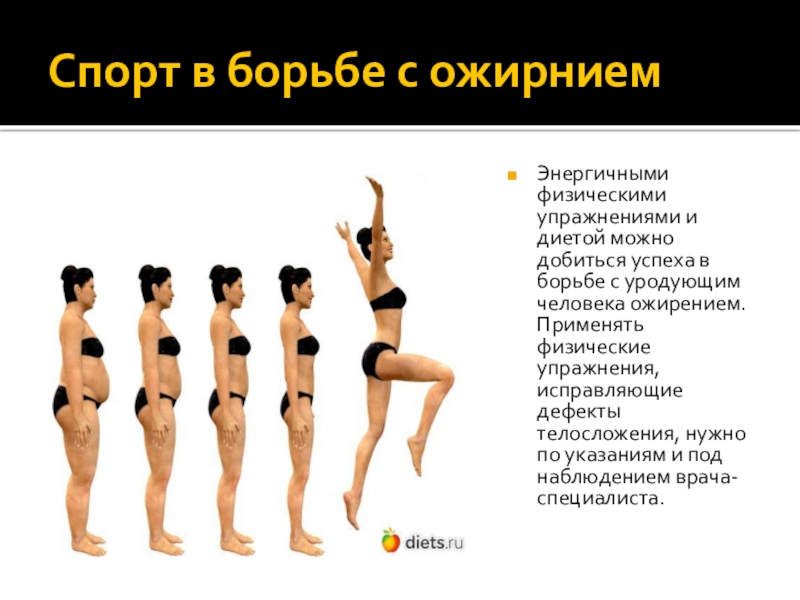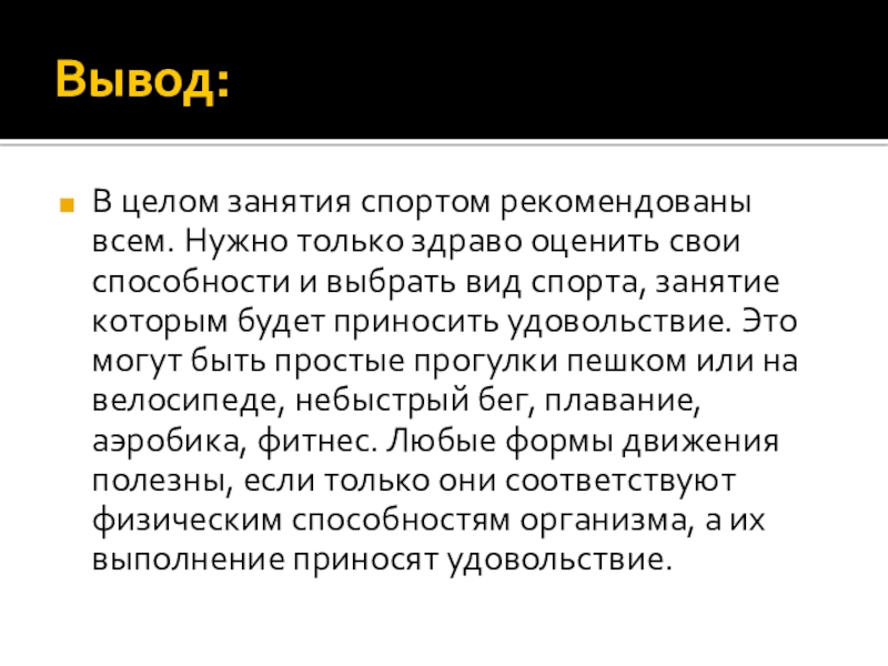 способности и выбрать вид спорта, занятие которым будет приносить удовольствие. Это могут быть простые прогулки пешком или на велосипеде, небыстрый бег, плавание, аэробика, фитнес. Любые формы движения полезны, если только они соответствуют физическим способностям организма, а их выполнение приносят удовольствие.