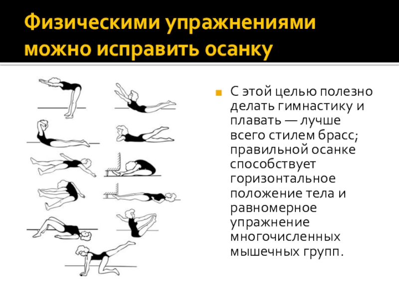 — лучше всего стилем брасс; правильной осанке способствует горизонтальное положение тела и равномерное упражнение многочисленных мышечных групп.