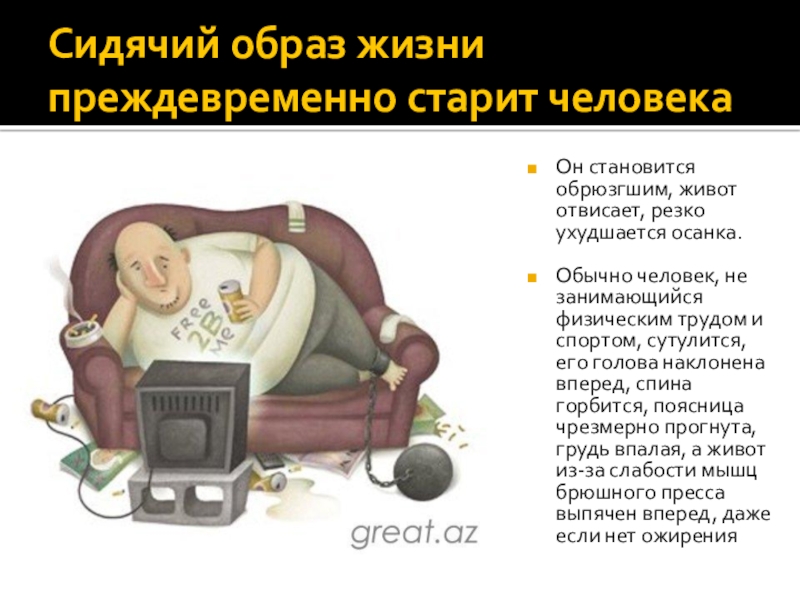 Слайд 16Сидячий образ жизни преждевременно старит человека