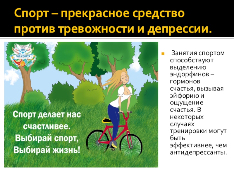 Слайд 14Спорт – прекрасное средство против тревожности и депрессии.