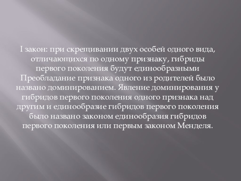 признаку, гибриды первого поколения будут единообразными Преобладание признака одного из родителей было названо доминированием. Явление доминирования у гибридов первого поколения одного признака над другим и единообразие гибридов первого поколения было названо законом единообразия гибридов первого поколения или первым законом Менделя.